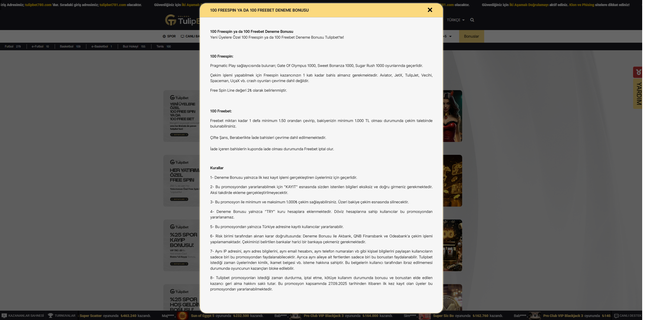 Bahis sektörünün en çok kazandıran firmalarından biri olan Tulipbet, yepyeni bir bonus sistemi ile kullanıcılarına para kazandırma fırsatlarını genişletmeye devam ediyor. Tulipbet bahis ile tanışan yeni kullanıcıların yatırım dahi yapmadan yeni bir üyelik ile 100 Freebet ya da Freespin deneme bonusu kazanma şansı sizleri bekliyor! Yeni bir üye kaydı ile kazandığınız bu bonusu kullanabilir ve kazançlarınızı aynı gün içerisinde çekim yapabilirsiniz. Bonusa katılım şartları ve kurallar ise ;